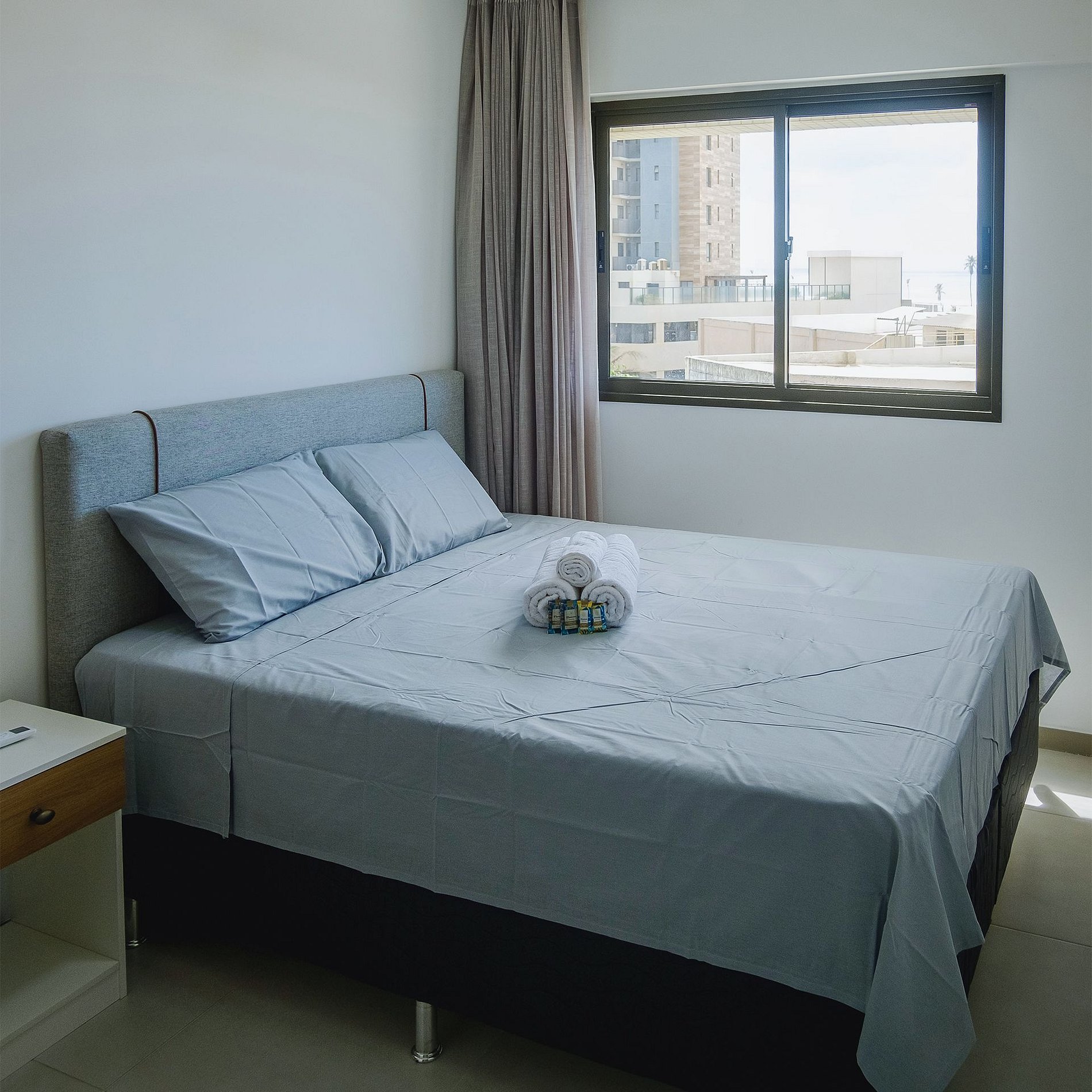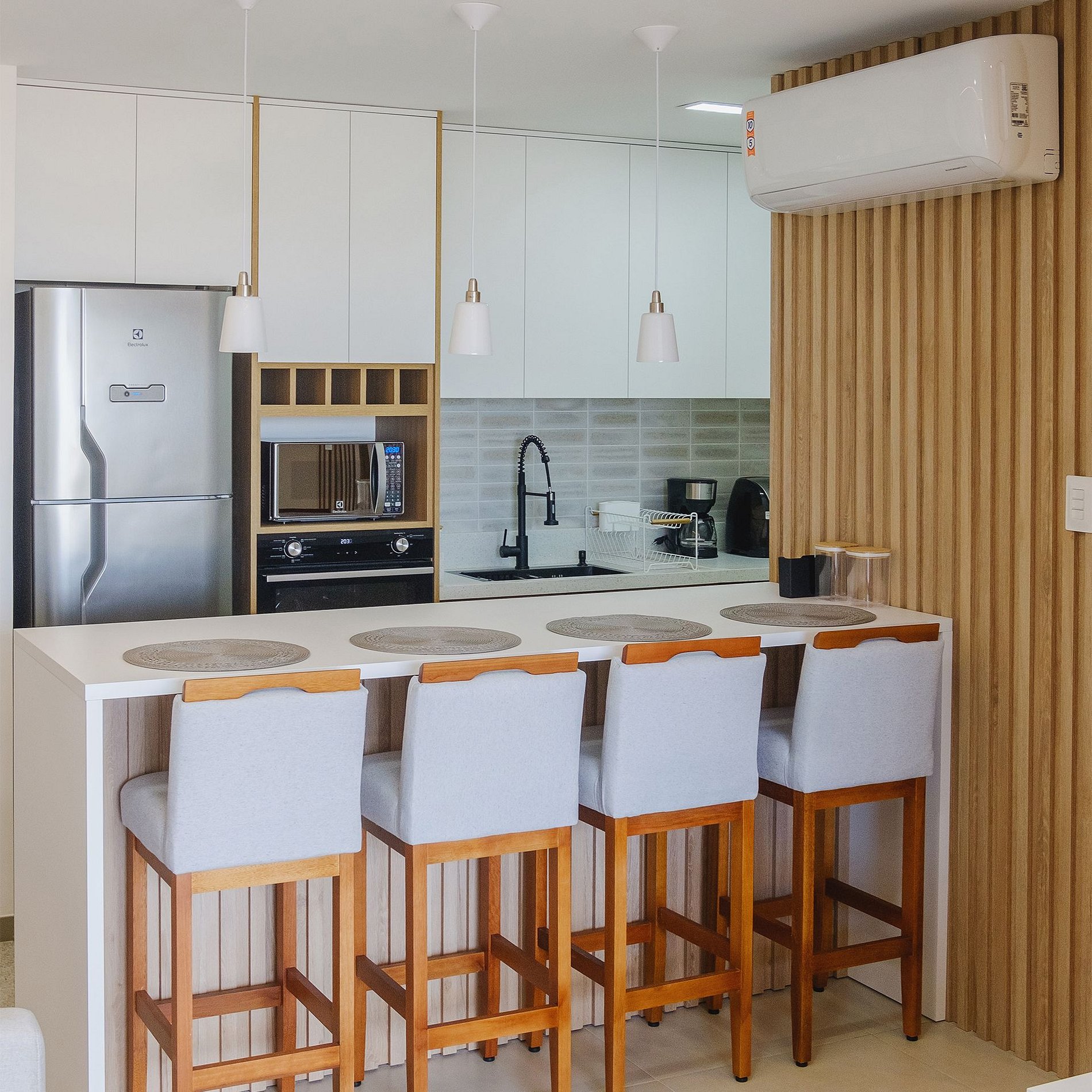 - Ambientes confortáveis e completos: Sala de estar com cortinas blackout, ar-condicionado, Smart TV, suíte com cama queen, cortinas blackout e ar-condicionado, quarto com cama de casal, cortinas blackout e ar-condicionado, varanda agradável e cozinha totalmente equipada, máquina de lavar, filtro de água, além de todos os utensílios necessários para sua estadia.