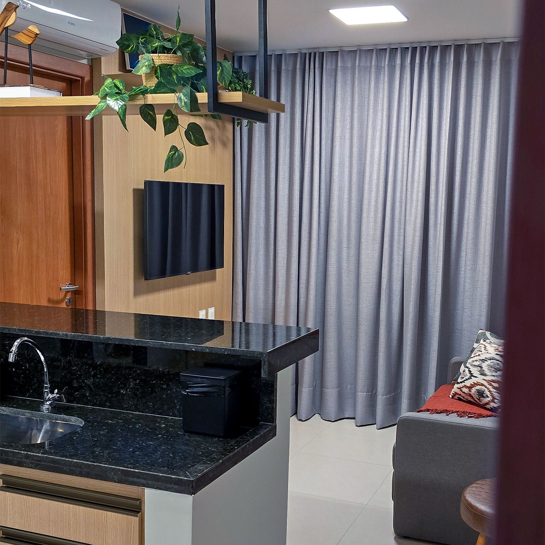 - Ambientes confortáveis e completos: Sala de estar com cortinas blackout, ar-condicionado, Smart TV, quarto com Smart TV, cama queen, cortinas blackout e ar-condicionado, varanda agradável e cozinha totalmente equipada com todos os utensílios necessários para sua estadia.